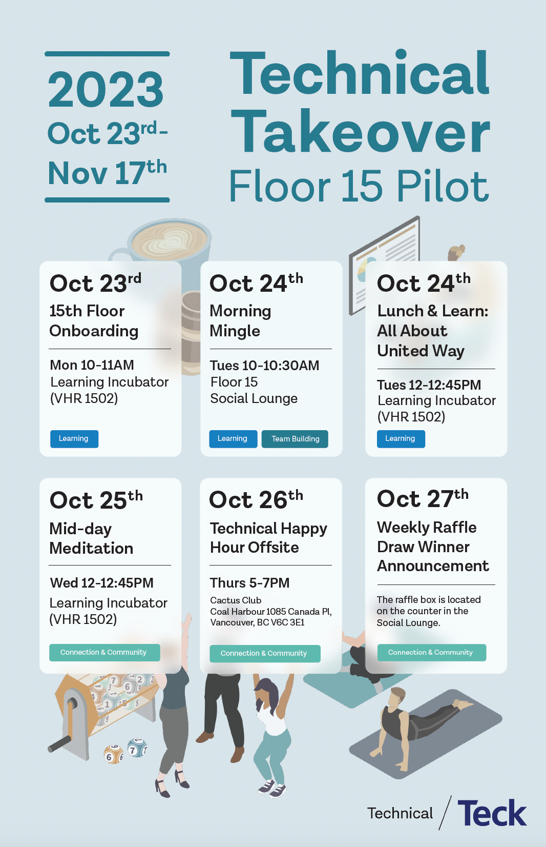 A four-week trial of the ‘Future of Work’ pilot floor at the Teck Vancouver Office. To maximize the space and its features, the Technical team hosts events like prize draws, lunch and learns, and social gatherings to enhance team bonding and space utilization.